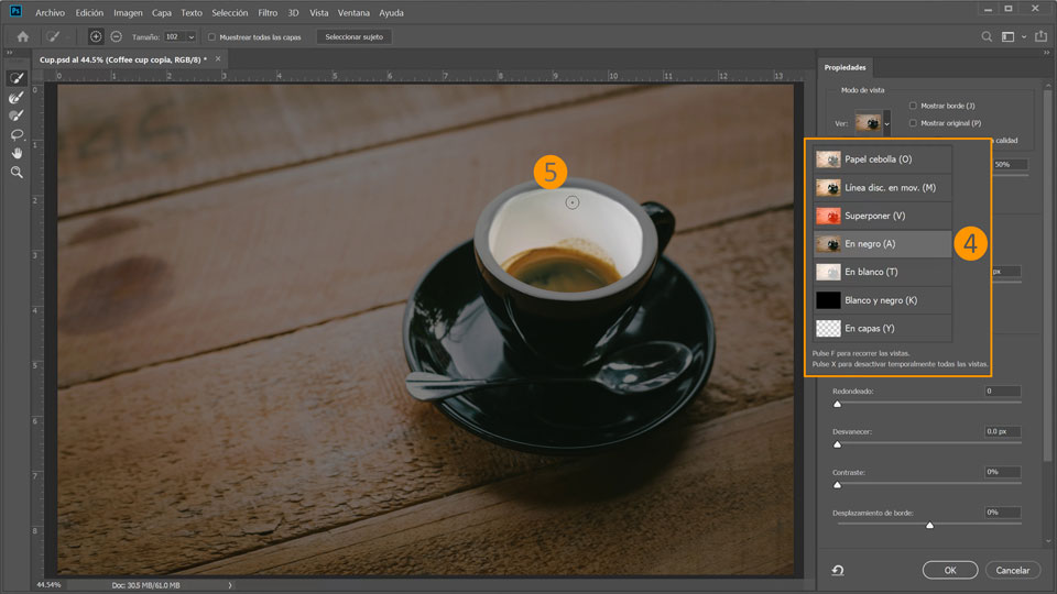 4. En el panel Propiedades que aparece, selecciona Ver > En negro. En la pequeña paleta de herramientas de la izquierda, selecciona el pincel Herramienta Selección rápida y ajusta su tamaño y dureza en la paleta superior.