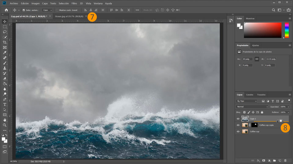 8. Crea una máscara de recorte para recortar la imagen del océano (Capa 1) según la máscara de la capa inferior: pulsa la tecla Alt y haz clic entre las capas o con el botón secundario en Capa 1 y selecciona Crear máscara de recorte.