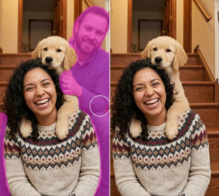 Usa la misma función que usarías para eliminar objetos de las fotos a fin de perfeccionar las tomas de un evento. Quita personas del fondo que hacen muecas, caminan por pasillos o arruinan momentos importantes.