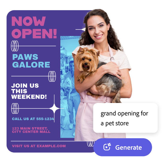 Maak snel en eenvoudig de perfecte poster voor elke gelegenheid met Adobe Express, de alles-in-één app contentcreatie met AI. Typ eenvoudig in een opdracht wat je wilt maken en kijk hoe de sjabloonopties worden gegenereerd op basis van jouw wensen. Veilig voor commercieel gebruik.
