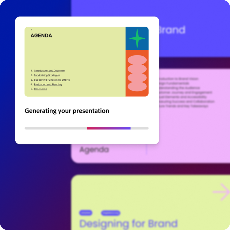 Importeer en bewerk je PowerPoint-dia's eenvoudig met heel veel ontwerpassets, sjablonen en krachtige generatieve AI-tools met Adobe Express. Met de AI-presentatiemaker kun je heel eenvoudig prestentaties maken door onderdelen te slepen.