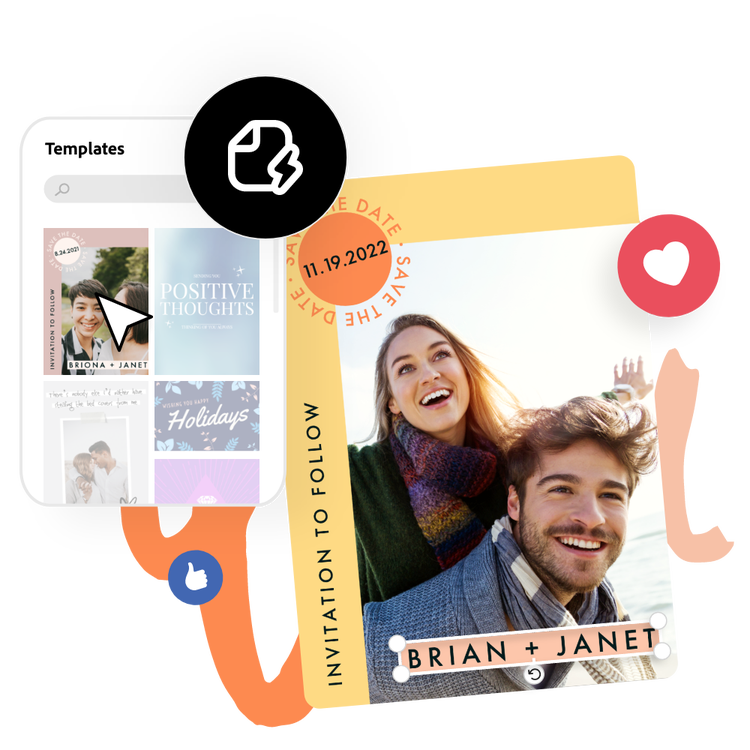 Of je nu een speciale gelegenheid viert of gewoon weer even contact wilt opnemen, het is altijd een goed moment om e-cards te versturen naar vrienden, familie en volgers. Begin met onze aanpasbare sjablonen en voeg symbolen en oprechte wensen toe om je e-card uniek te maken. Met Adobe Express maak je eenvoudig en probleemloos jouw eigen betekenisvolle e-cards.