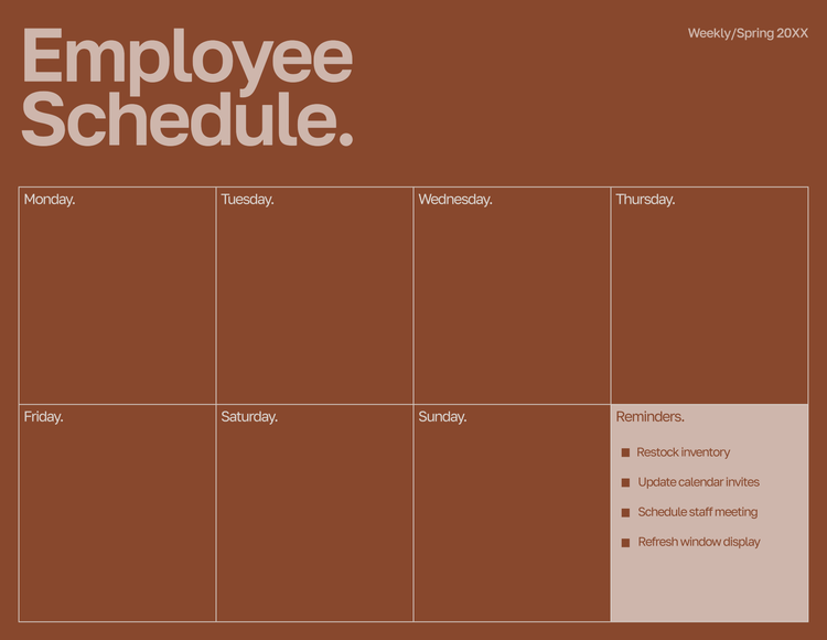 Ontwerp een rooster dat past bij jouw werkplanning. Voeg belangrijke datums en afspraken toe die nooit veranderen. En personaliseer de roosters zodat ze er opvallend uitzien en zodat ze passen bij je merk. Er zijn talloze kant-en-klare roostersjablonen beschikbaar, boordevol ontwerpkenmerken die alle goede roosters nodig hebben. Voer je eigen informatie in en druk het rooster af of deel het direct.