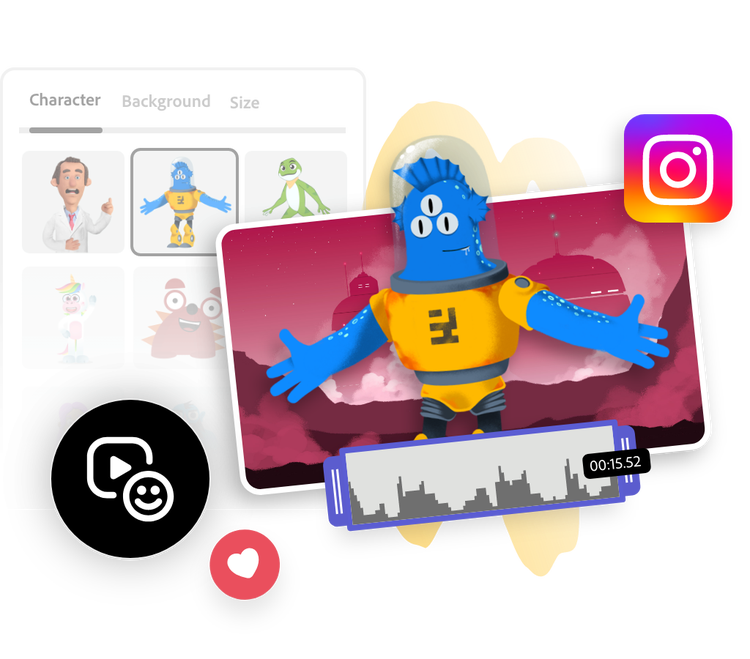 Breng jouw Instagram-verhalen, -reels en -berichten tot leven met een animatiefiguurtje gemaakt in Adobe Express, helemaal gratis.