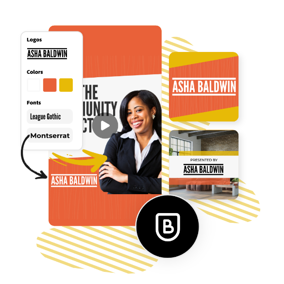 Laat kijkers kennismaken met jouw merk met behulp van de merktools in Adobe Express. Maak je eigen merkmiddelen en pas deze in een oogwenk toe op jouw marketingvideoproject vanuit je browser. Upload eenvoudig je logo en selecteer de kleuren en het lettertype. Vergroot je bereik door het videoformaat in een oogwenk te wijzigen en de video te delen op al je sociale kanalen.