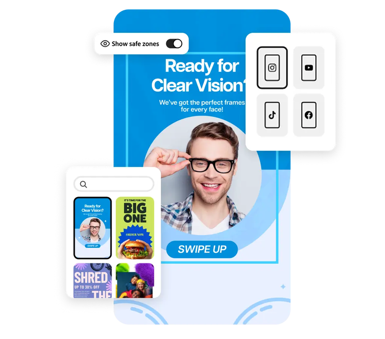 Met Instagram Safe Zones in Adobe Express kun je er makkelijk voor zorgen dat je afbeelding of video de juiste grootte en uitsnede heeft voor weergave in Instagram-reels of -berichten. Upload je media en bekijk meteen hoe je content op de tijdlijn wordt weergegeven.
