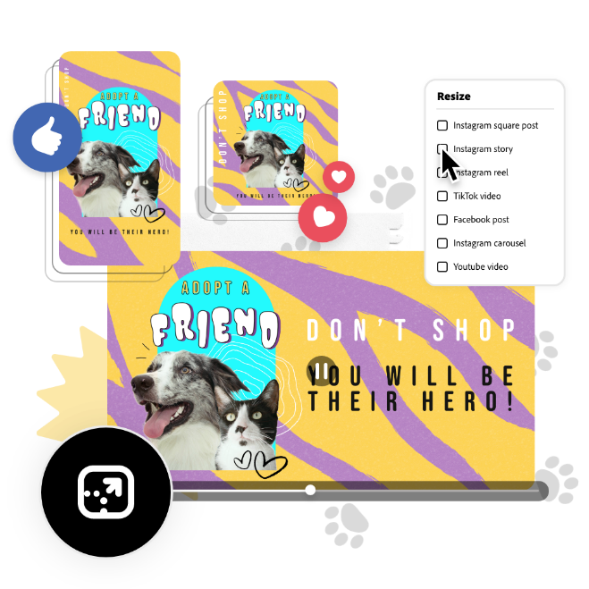 Maak gebruik van de probleemloze opties voor formaat wijzigen in Adobe Express. Zodra je klaar bent met het bewerken van video’s, kies je Formaat wijzigen in de online-editor en selecteer je de platformafmetingen die je wilt gebruiken, van Instagram-reel tot Facebook-verhaal, of download de video naar je laptop als MP4-bestand. Als je de video nog verder wilt bewerken, dan slaat Adobe Express het werk veilig voor je op.