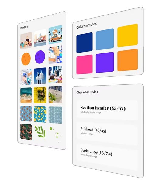 Werk met logo's, illustraties, kleuren en nog veel meer via doorzoekbare Creative Cloud Libraries die eenvoudig te delen en toegankelijk zijn vanuit Creative Cloud-apps.