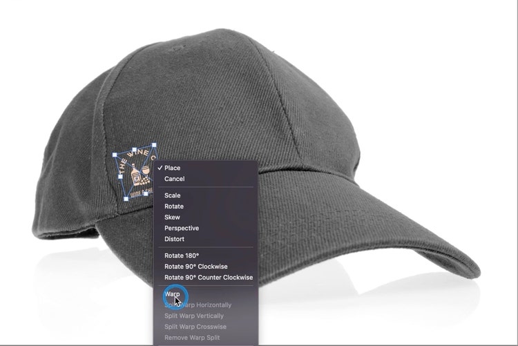 Bring your design or logo into the group and scale it to the desired size. To create a more realistic look, you will need to warp the design or logo to look like it is a part of the image you are overlaying it on. To do this, select the design or logo, CTRL+T on PC or CMD+T on a MAC to Transform > Right Click > Select Warp. From here, adjust the corner handles and the grid to match and select the check mark when ready to apply the changes.