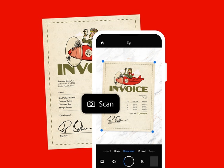 Twórz pliki PDF, skanując dokumenty aplikacją Adobe Scan. Następnie możesz je przeglądać, edytować, podpisywać i udostępniać w aplikacji Acrobat Reader — nadal na telefonie.