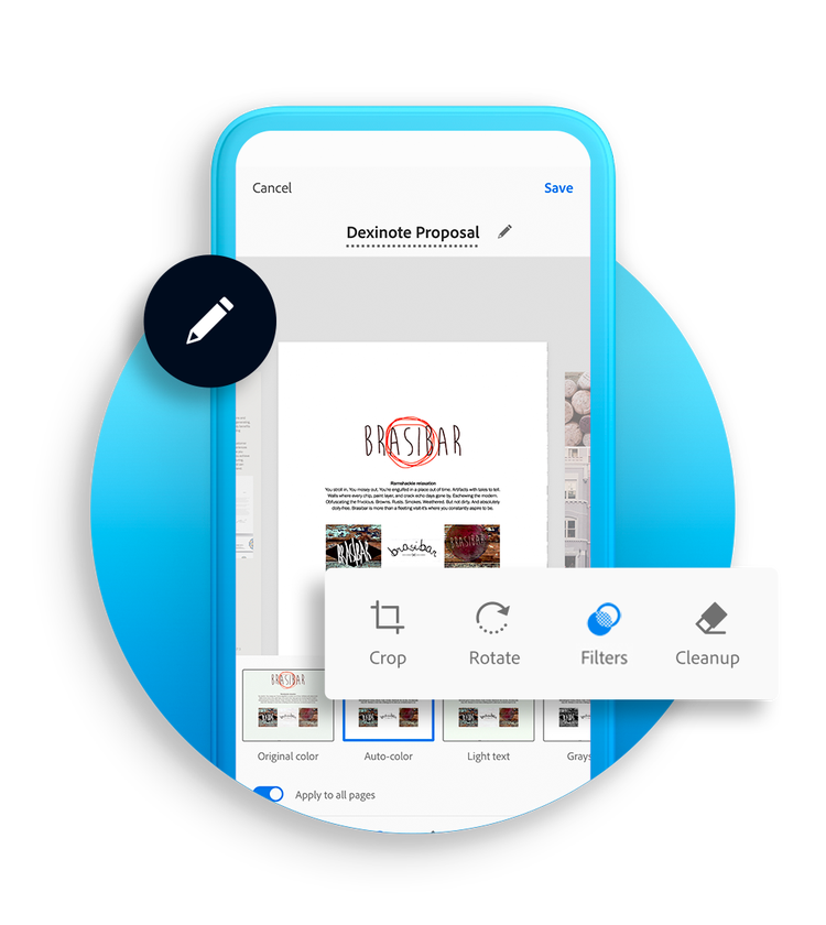 Aplikacja Adobe Scan umożliwia dodawanie rysunków i kształtów za pomocą narzędzi do oznaczania bezpośrednio w aplikacji. Zapisuj pliki w formacie JPEG, aby uzyskać większą elastyczność, i włączaj je do dokumentów. Udostępniaj skany za pomocą łączy lub wiadomości e-mail albo przesyłaj je do ulubionych aplikacji w chmurze.