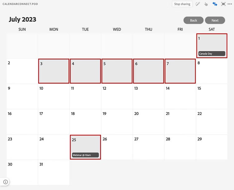 - Shared calendar. Hosts can change the month and highlight dates for everyone in the room to see.
