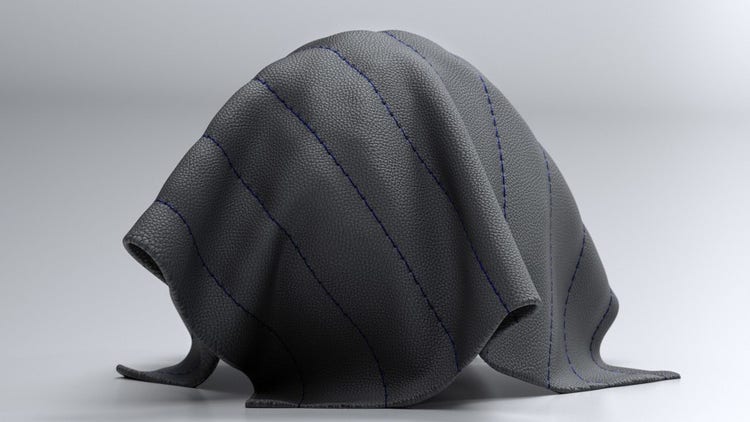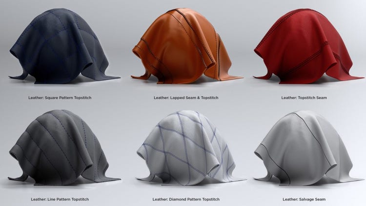 The result: high-quality scans of leather grains mixed with a procedural generator capable of creating several configurations of leather seams, topstitching, welts and sewn patterns.
