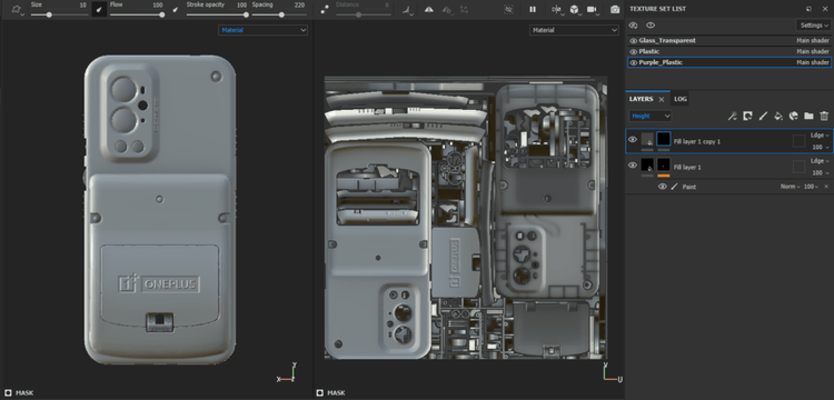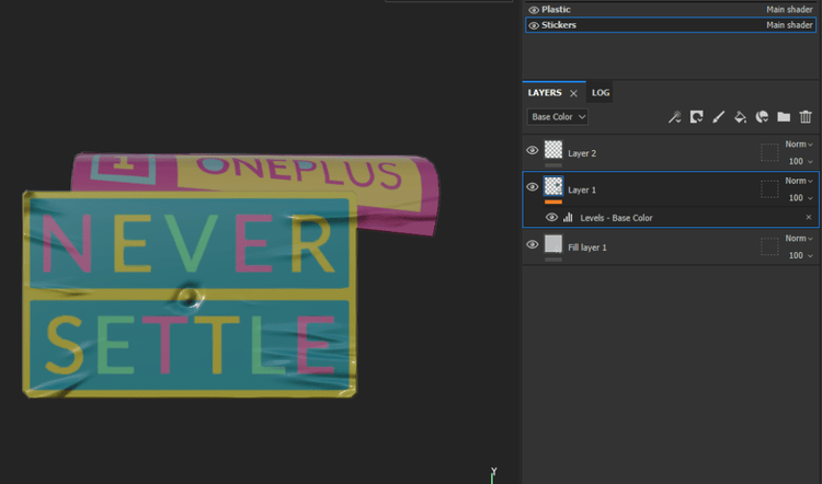 For this I could totally use Painter to add these kinds of details without any modeling: I just had to duplicate some planes on top of the phone to play with opacity. I hand-painted the fold on a layer dedicated to the height of my stickers to make it more realistic.