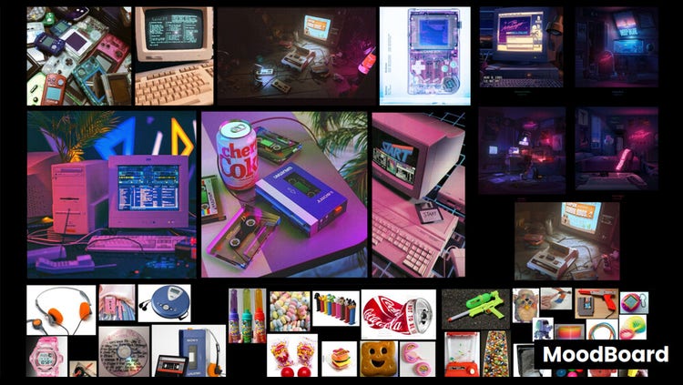 Priskah: I did some research in terms of color scheme/texturing and scene mood. On Pinterest, you can find inspiration from the early ’90s kids’ rooms to the ’90s tech designs we had: plastic-made, chunky models, pastel colors, and so on.