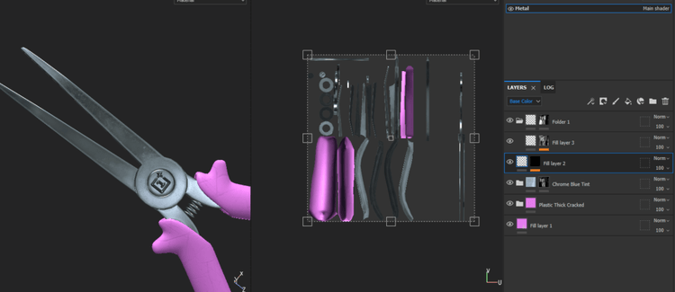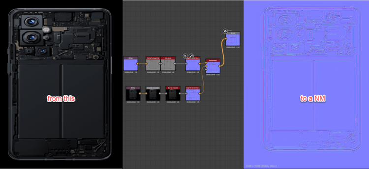 In Substance 3D Designer I could easily tweak some values, and with some nodes convert it to a normal map: I just had to tweak some values in Photoshop to create a metallic map, and the trick was done.