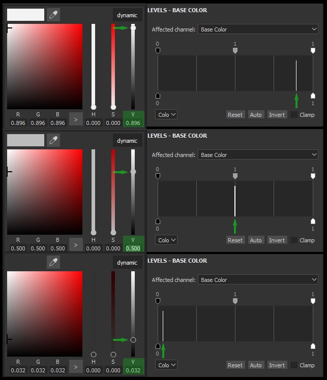 The values for coal (50sRGB), mid-gray (186sRGB) and snow (243sRGB) translate to the following in Substance Painter: