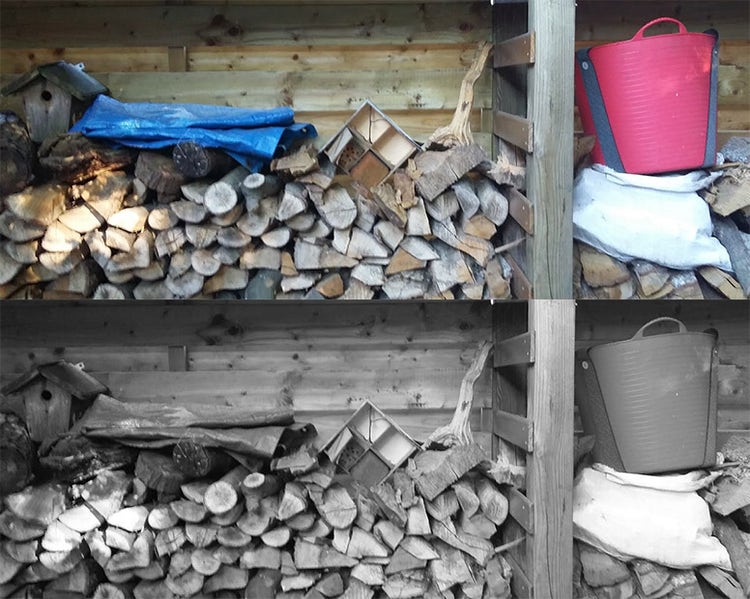 In this photograph, the blue sheet and the pink bin stand out. But if we only look at the values , the blue sheet has the same value as the wood it’s lying on. The pink bucket has a darker value than the wooden frame next to it.