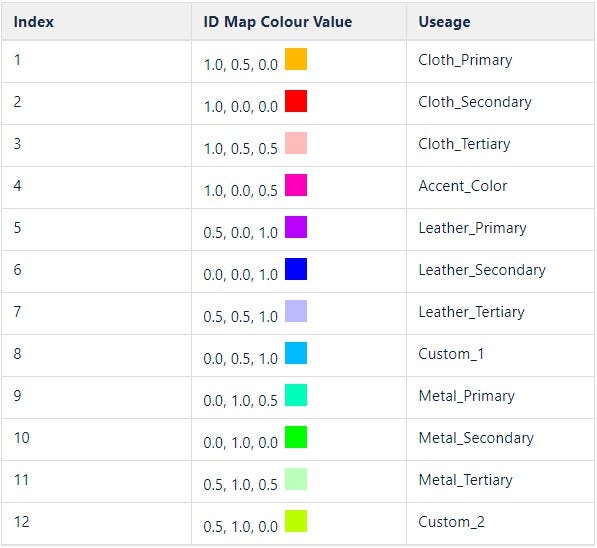The main focus of our armor shader is also color customization. Here the setup is a bit more common than with skin. We have base color and ID maps that look like this: