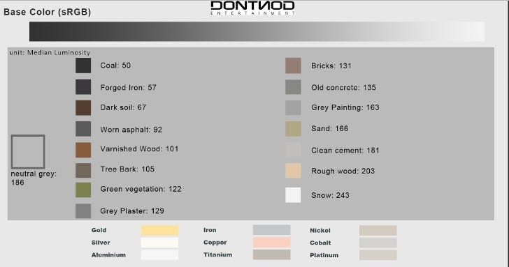This color chart is not meant as the de facto colors we need to use. Instead, it should be used as a frame of reference to help artists define correct values for their assets, the darkest substance being coal and the brightest being fresh white snow.