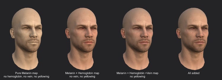 With this approach, instead of having one base color map we ended up with four maps: hemoglobin, melanin, vein, and yellowing maps.