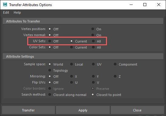 Inside Autodesk Maya, I import my quilt plane meshes. First I select my high poly mesh and then low poly mesh. I then use “Transfer Attributes” to transfer the UV to my new mesh.