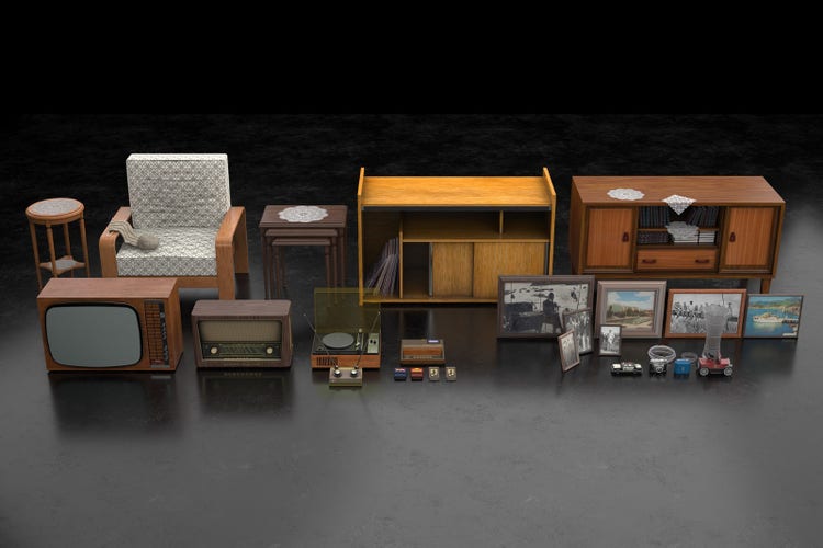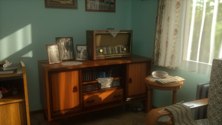 I wanted to recreate a typical older relative’s apartment. I have such vivid memories of these places! They’re a bit boring, but if you’re lucky, there’s also the holy grail: a game console, which is essential to entertain the kids.
