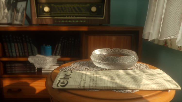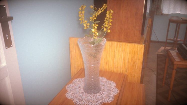 I tried different types of lighting conditions for this scene, and it took several attempts before I was happy with the balance between stuffy and peaceful.