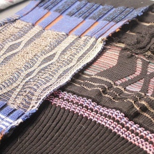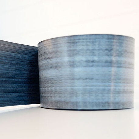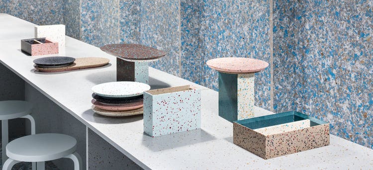 UK-based Smile Plastics also make composite sheet materials with recycled materials. The result is clearly visible in the material surface – from yoghurt pot foil covers, fragments of plastic bottles to chunks of old chopping boards, to name just a few examples from the standard collection.