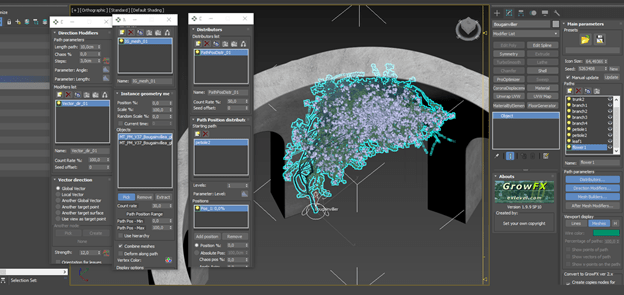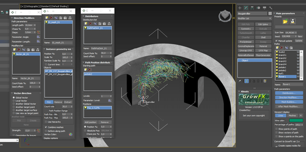 Maxtree has good 3D models of plants. These work especially well because you can get the GrowFX file for each model, which is completely modifiable. Instead of starting from scratch I reworked one of the models from the Maxtree collection, bending the general shape of the plant around the arch present in this alcove.
