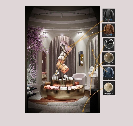 With this brief in mind, I began to concretize my ideas around this notion of a luxury, exclusive-feeling showroom. The kind of place that you might find as part of a priority airport lounge. The conceptual aspect of the space would derive from the materials of the products sold there: building from the initial brief, I imagined a place where the client could select the particular product they want, and then choose between different possible finishes. So let’s say, for instance, that someone loves the shape of a pair of shoes, but they want a specific leather. In this case, they just need to check the materials available to order their own version.