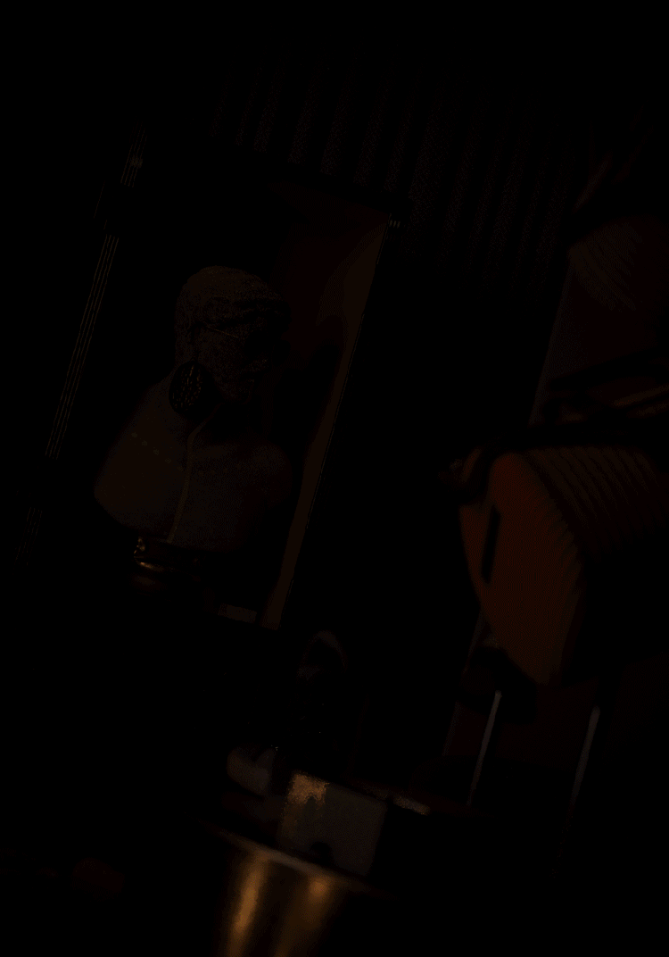 The model of the bust comes from a cool website that provides scanned 3D models from museum collections. It’s a real statue, somewhere out in the world. The makeup on the bust is of course inspired by musicians such as Kiss, and particularly David Bowie . It very intentionally matches the color of the sunglasses – it gives the impression that the color from the glasses is glitching out, drawing a shape on the face. The earrings provide modernity, bringing this section of the scene into the modern day.