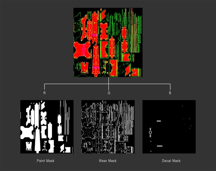 This greyscale mask would then get packed in our AMST (AO, Metallic, Smoothness, Tint Index) texture.