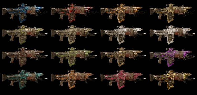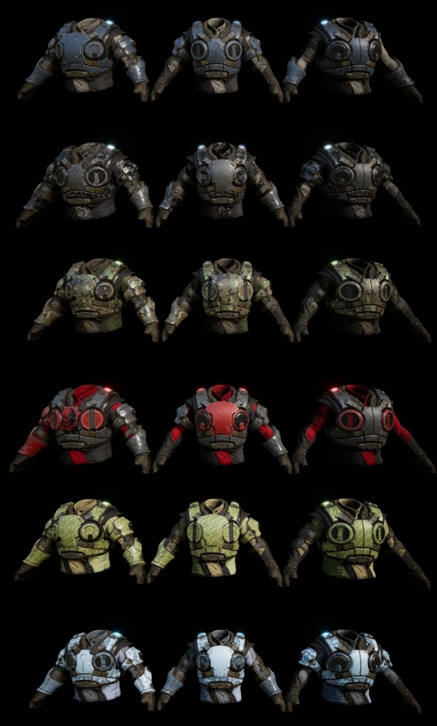 Nathan: We used Substance Painter to create an advanced id mask for character armors and weapons. The id mask is used in the shading part of customization system that allows artists to apply color tints and metal variations from skin data.