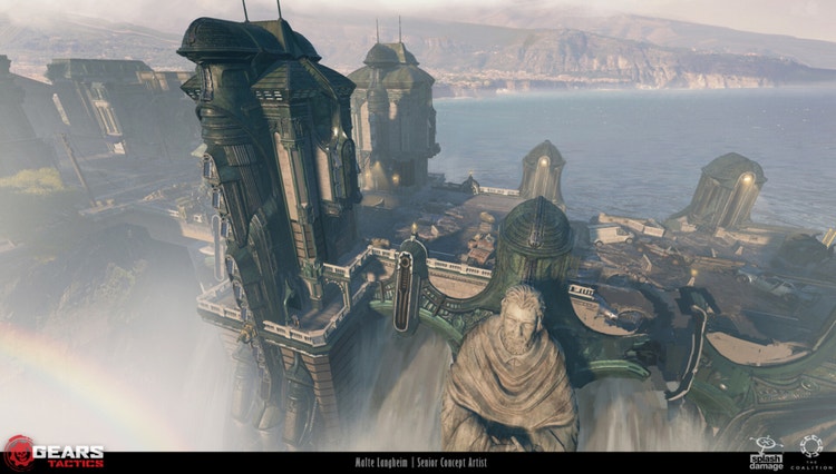 Akash: Destroyed Beauty. We used this phrase a lot when we started making Gears Tactics. The Gears Universe is actually very beautiful with intricate patterns and trims. Even after the destruction, we wanted to keep that beauty in it and not just make it into a rubbly mess of dirt and concrete. Even the most unspoiled areas will display some dramatic scars of war, while the most devastated places will still maintain traces of hope. Every environment should tell a story of conflict in the end.