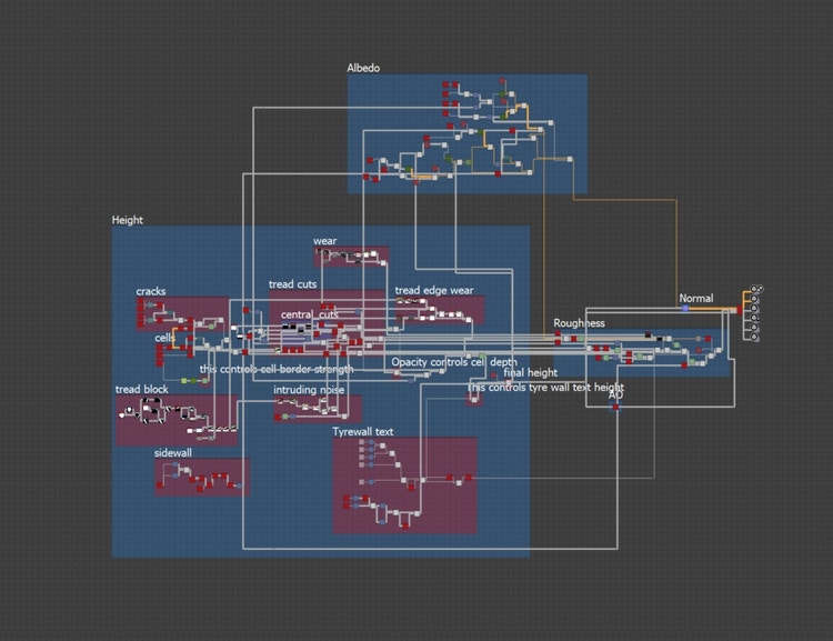 The albedo, again, begins as a series of blended grunge and noise nodes. These are then masked into a uniform color that represents our base rubber albedo. The tread blocks that meet the ground will pick up more dust and grime. A dust layer is created in the same way as the base rubber albedo and masked in using the height so that only the outer tread blocks receive a thin, subtle layer of grime and pickup.