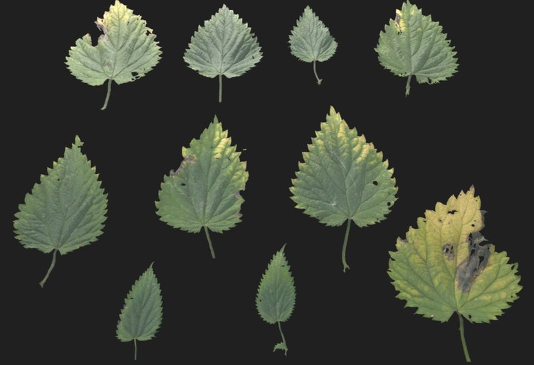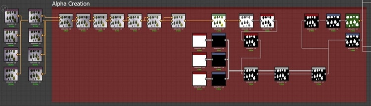 To get the opacity map, we take the original eight images and pass all of them through a Blend node in Max Lighten until it overexposes the background, which leaves the silhouettes of the leaves. A Level is applied, and it is then converted to greyscale and placed through a Histogram Scan node, which is then inverted. This produces our opacity map.