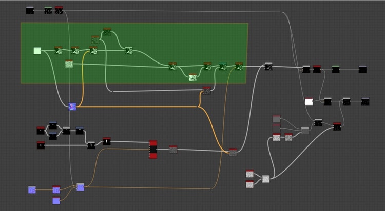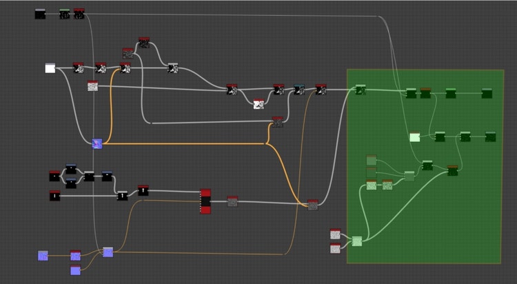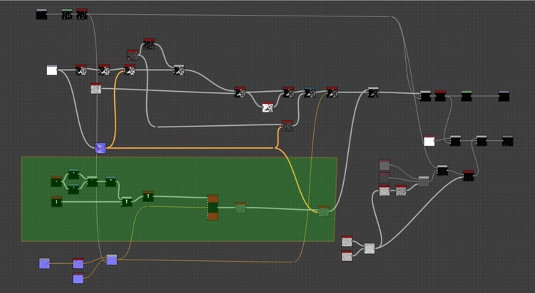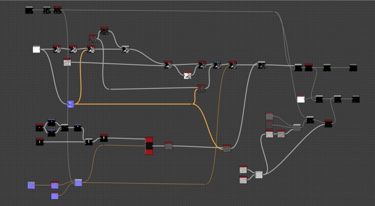 We then move on to the area where the flow map, created in Substance 3D Painter, is utilized to give us directionality throughout our roads. The directional texture is generated from a single Tile Sampler node, keeping the timings down for speed. A simple shape is drawn into the sampler node and tiled based on the flow map; this is then combined with the previous mask to give us the directionality within the puddled areas.