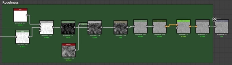 For the roughness, we use the AO map as a base, and we then use a combination of levels, blends, and background noise to generate the roughness map.