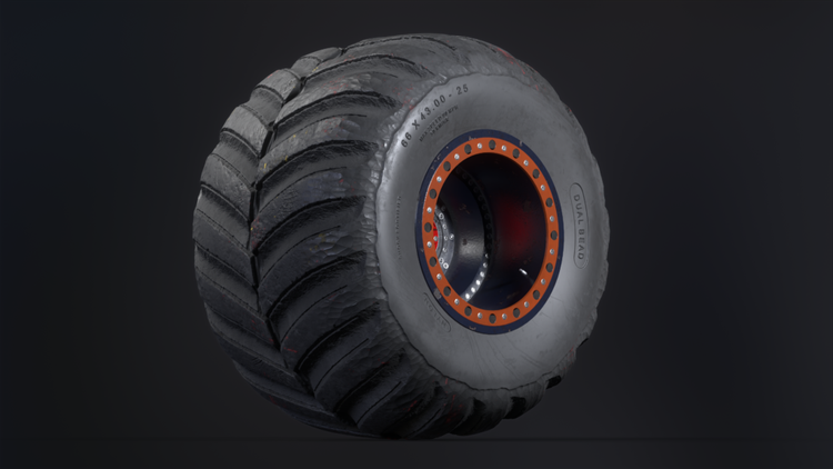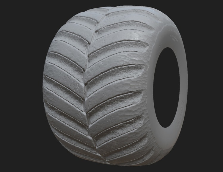 As the grooves and chisels of the monster truck tires are defining features of the material, we sought to replicate them. More shapes are blended in along the way to achieve this.