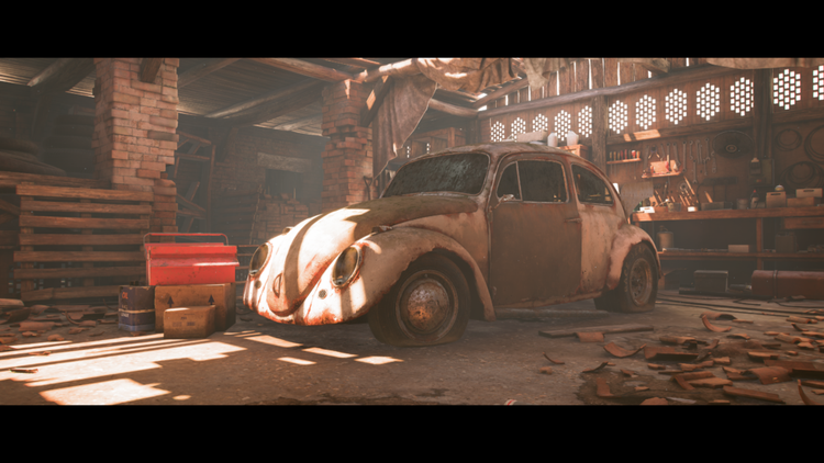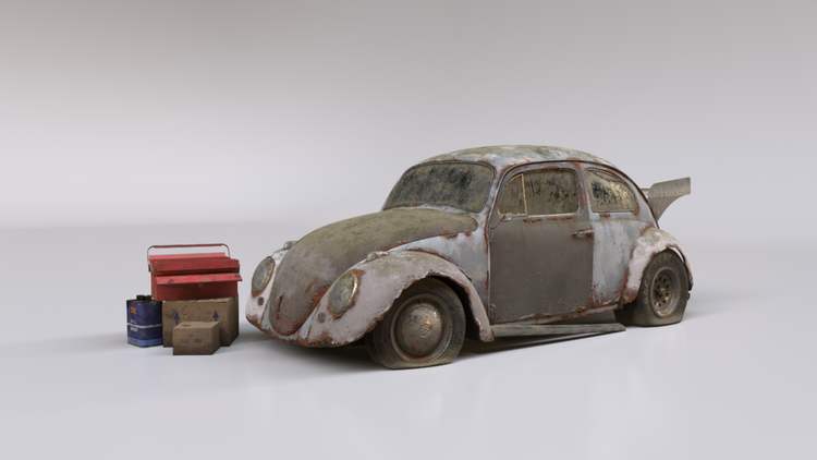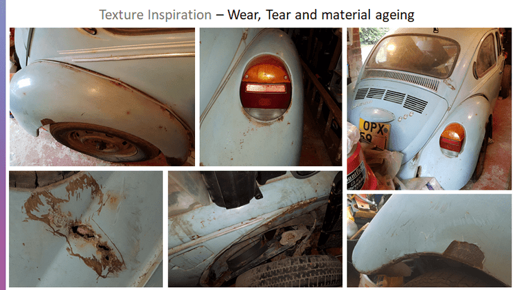 This is a classic 60s Beetle, the materials used in this era and of this age will suffer heavily from rust and rot, particularly with the barn being quite damp. With what once started out as a rust generator, we built upon this to create our own Smart Material. We now have a library of Smart Materials to cover many material types; these Smart Materials can quickly be shared and used in other barn finds. This allows a consistent visual across assets and provides a great platform that we can expand upon. With any procedural generator though, we never just leave it at that; as good as it can look, it still looks generated. It lacks that artistic touch.