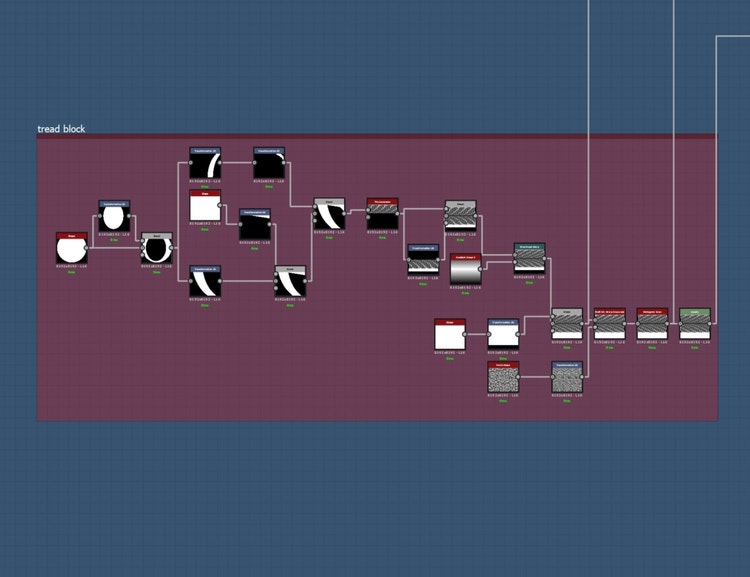 Once the larger defining features were done, our focus shifted to the smaller details like cuts, gouges, and scrapes on the tire surface. We implemented these by using multiple noise nodes blended with edge detects, and then balanced out with Curve and Levels nodes to achieve the desired depth of these details.