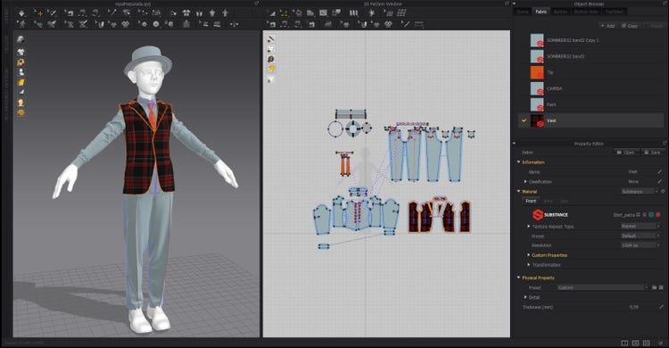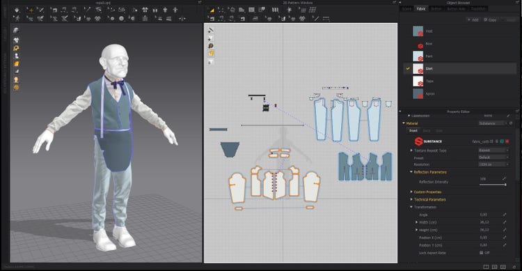 While I’m creating the different parts of the outfit, I distribute them by layers; this helps to avoid any intersection or flickering problems. Once the outfit is complete, I use the Substance in Marvelous Designer plugin to rapidly view different textures over the cloth adapted to the character. For this, I use my personal predefined materials in Painter and adapt the scale and roughness. This allows me to move ahead in the workflow, and makes the texturing process in Painter easier.