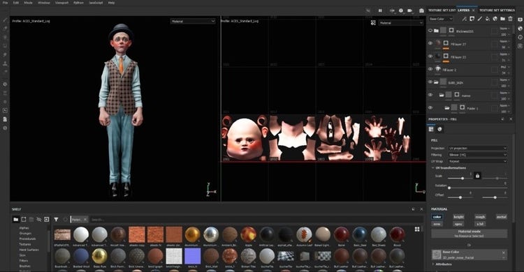 I create the distinctive pattern of the boy’s vest with a predefined sample file, ‘Tiling material,’ that comes by default in Painter. It’s a sample that I’m used to working with in order to create tileable textures quickly. Also, when I work in Substance I add post-processing effects; those I use a lot include the Iray renderer with my own HDRI. Like this, I can see how the project will look in the final render.