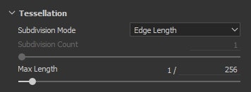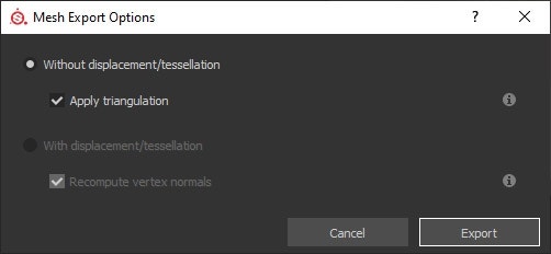 Tangent: This model is not using displacement. If your model has the option to export with displacement, your print will include the physical texture. It will also produce a larger file. To keep the detail and a reasonable file size, change the shader tessellation settings to use an edge length of 1/256 or less.