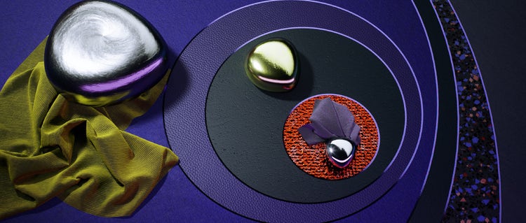 Architectural forms are trimmed or framed with neon accents. Curved and undulating shapes have an otherworldly quality, emphasized with fluid embossed surfaces or circular faceting.