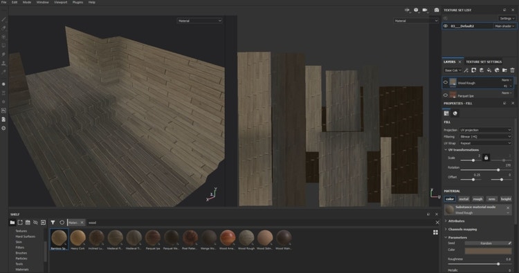 Here is a basic setup applying the wood texture to the interior scene, and tiling it the way I imagine it. I’m using a material from Substance 3D Assets and playing around with its values.
