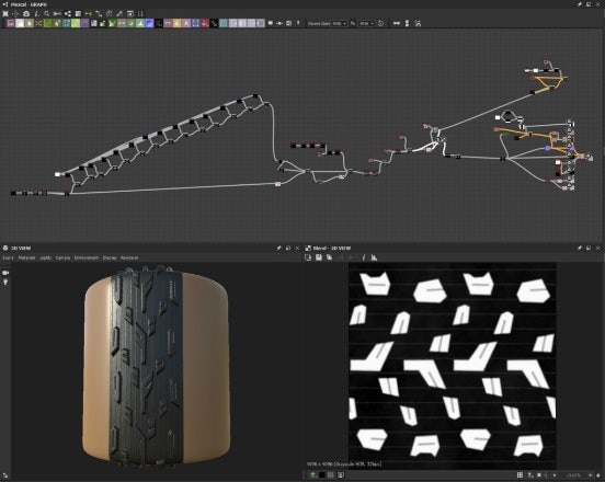 I used as a base material a shader from Substance 3D Assets, then I painted the blue line detail and on top of these layers I placed another dirt material with a hand painted mask that covers just the central part of the tire.