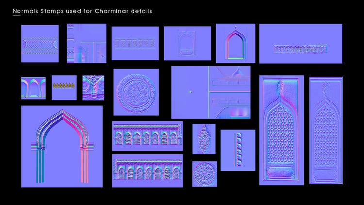 We decided early on that Charminar needed special attention. As this Indo-Persian architecture-inspired mosque has a lot of repeating patterns, such as similar doors and windows, we took the route of making normal stamps. Making normal stamps saved us a lot of work, as making a single high-poly model and pulling the details would have led to a lot of lost detail on mobile platforms, causing the asset to appear pixelated.