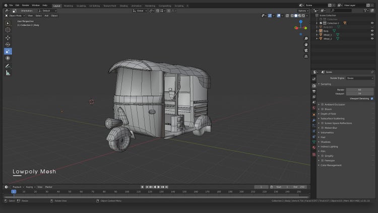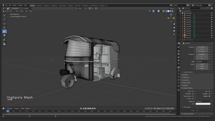 We first model a low-poly mesh and a high-poly mesh of the auto in Blender. We bring the high-poly mesh into Substance Painter to generate all the different maps, like normals, curvature, AO, thickness, and position. Then we apply all these maps onto the low-poly mesh. This helps us to have low poly count with great-looking visuals on mobile devices. The tuk tuk shown below is the classic auto in the game, which is very close to real autos in Mumbai and Hyderabad.
